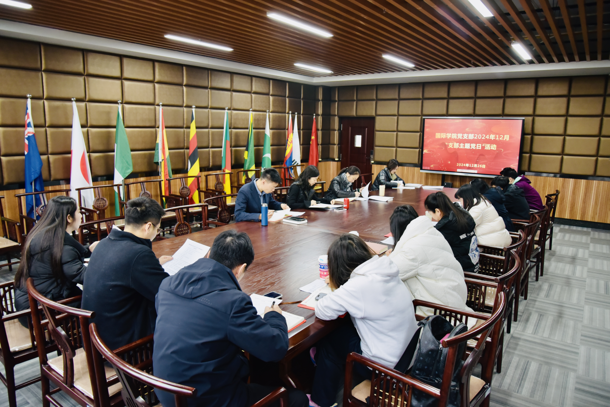 2024年12月26日,国际学院党支部在学院第一会议室召开以“深学细悟强信念 总结提升再出发”为主题的党支部主题党日活动。本次活动由国际学院院长、党支部书记杨霞主持,全体党支部成员参会。