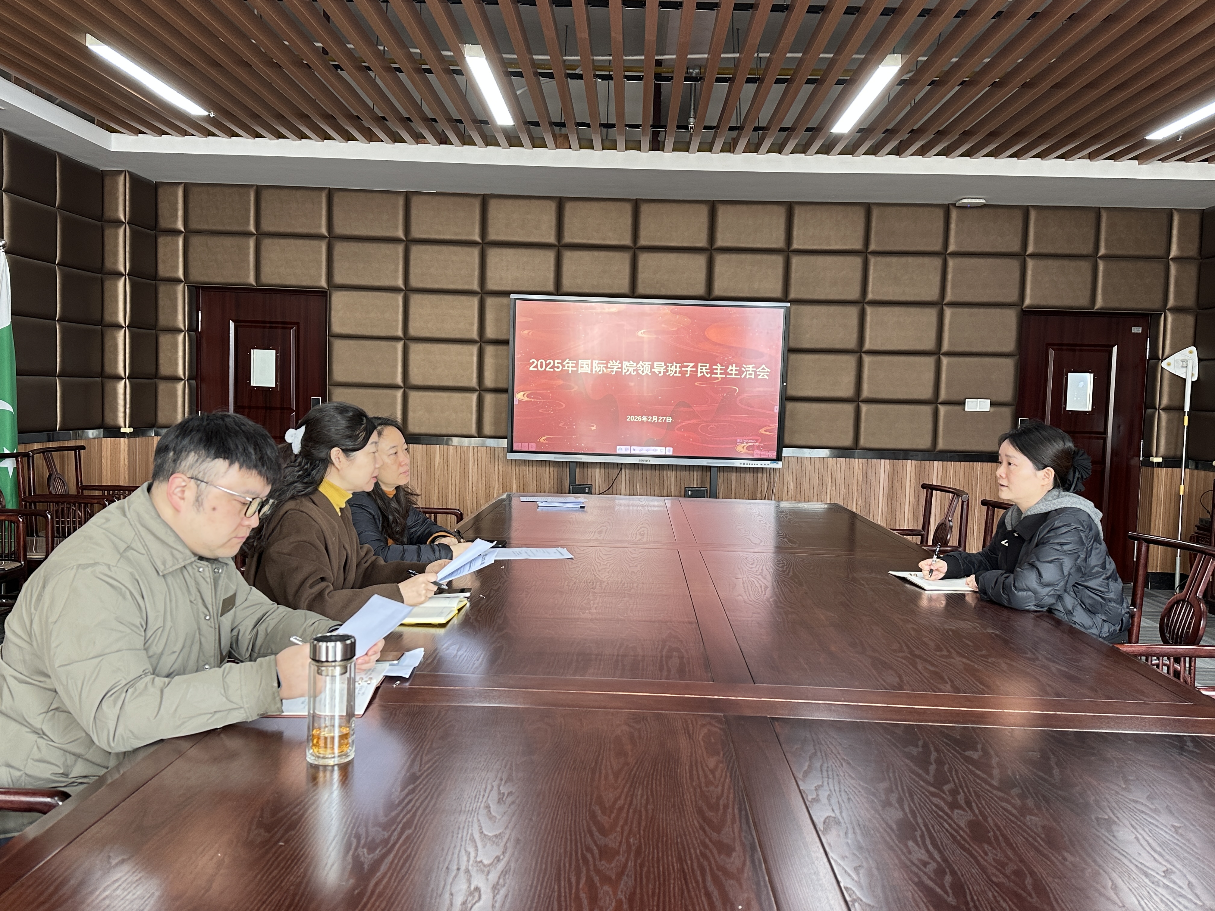 2月27日下午,国际学院2025年度领导班子民主生活会在第一会议室召开。院长、党支部书记杨霞主持会议,副院长龙曼莉、吴题参加会议。本次民主生活会紧扣主题,坚持问题导向,认真开展对照检查和批评与自我批评,达到了统一思想、增进团结、改进工作的预期效果。