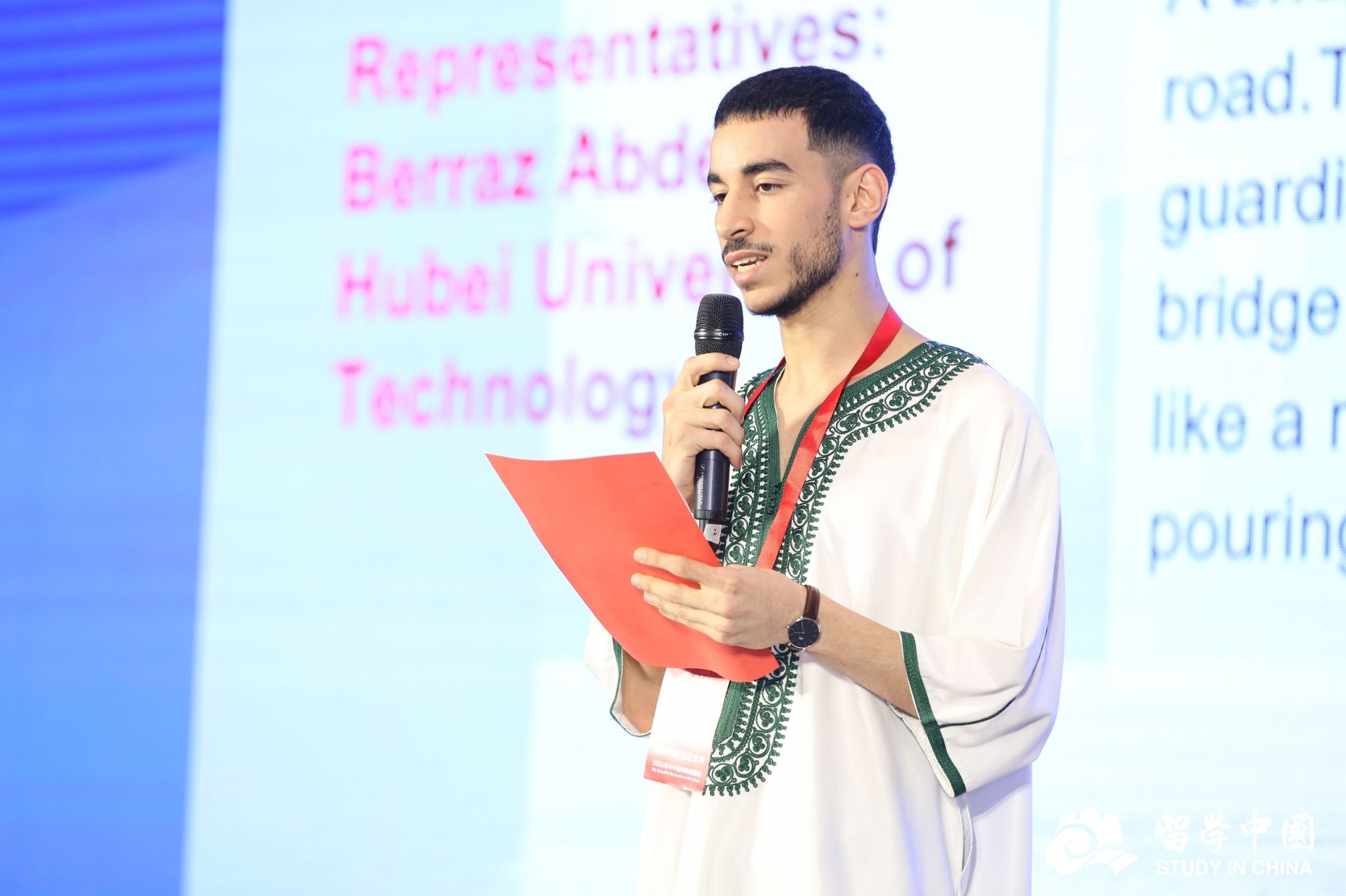 在颁奖仪式上,我校国际学生杜宇荣幸地作为留学生获奖代表进行了现场成果展示。他以饱含深情的中文朗诵,为在场的观众们带来了征文选段的精彩演绎。