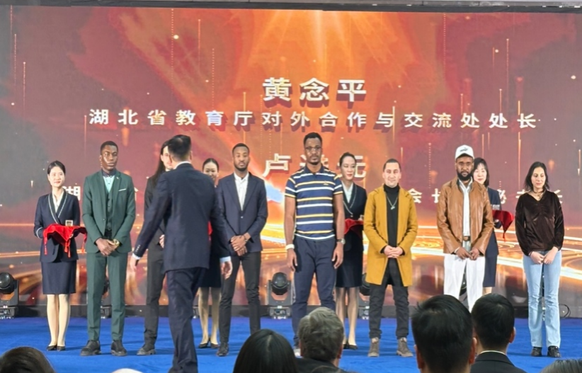 我校国际学生富兰克林荣获湖北文旅大使第二名,湖北省教育国际交流协会会长蒋涛为文旅大使颁奖。