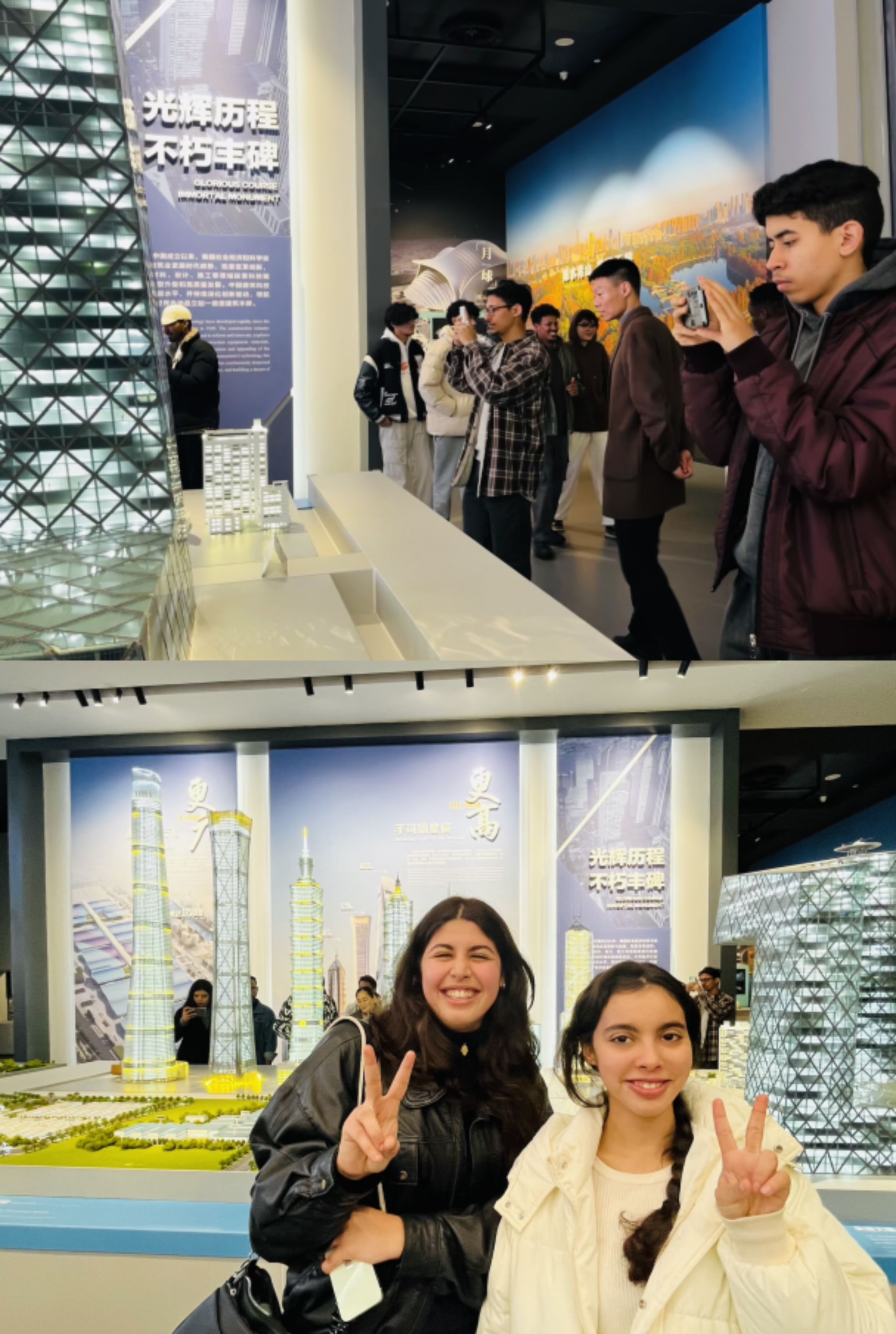 在现代和未来展厅,学生们看着一栋栋高楼模型耸立于天际,璀璨夺目,都惊呼现代的中国建筑如此气势恢弘,科技感与现代感十足,它们是现代科技的结晶,是人中国智慧的象征,每一座高楼都在讲述着一个关于创新、进取和梦想的故事。大家情不自禁纷纷拿起手机合影留恋。