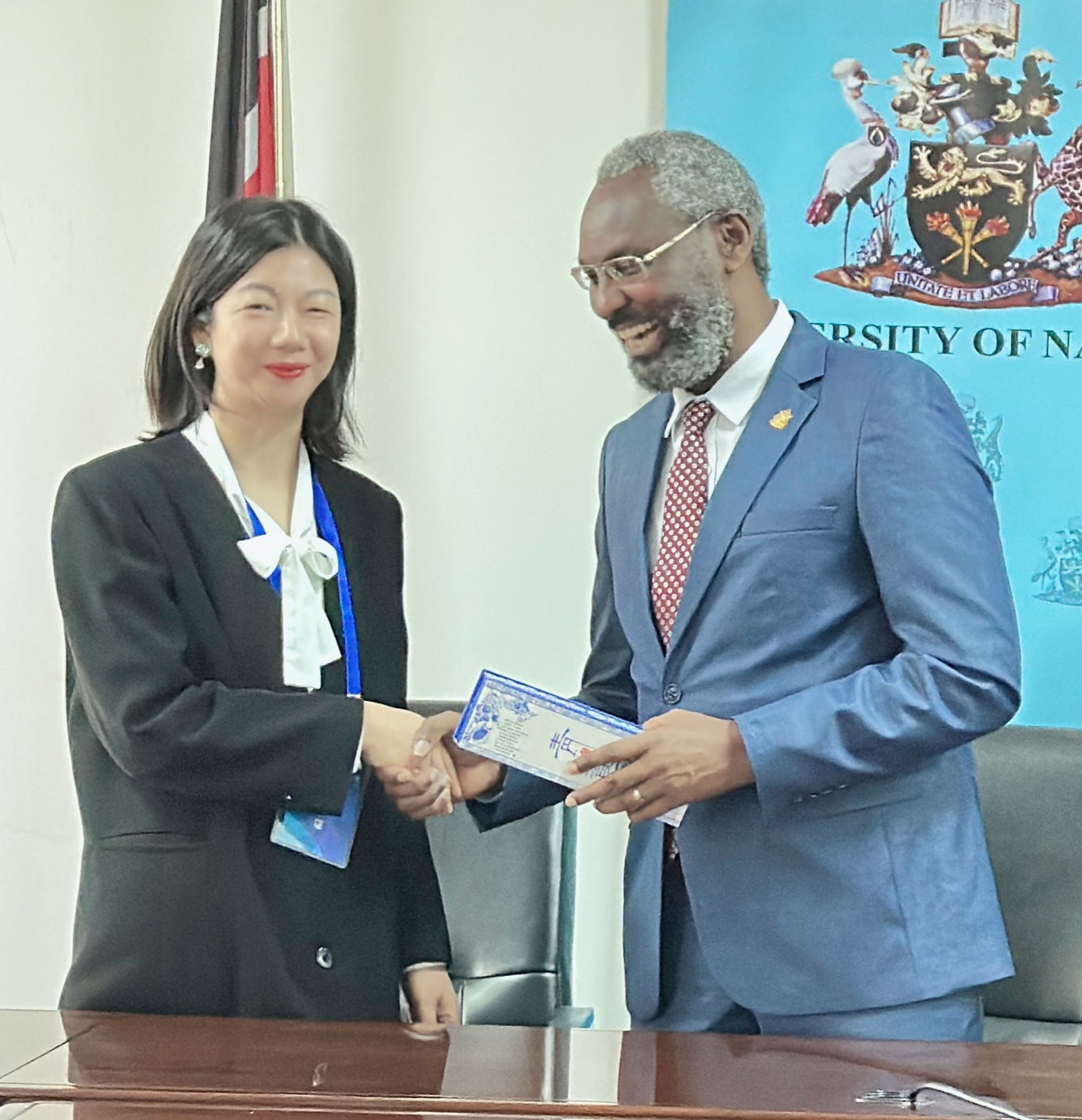 11月1日,“2023湖北高等教育非洲展”座谈会在肯尼亚内罗毕大学举行。座谈会上,国际学院院长杨霞回顾了内罗毕大学校长KIAMA访问我校以及两校合作的基本情况,双方进行了深入交流并互赠纪念品。
