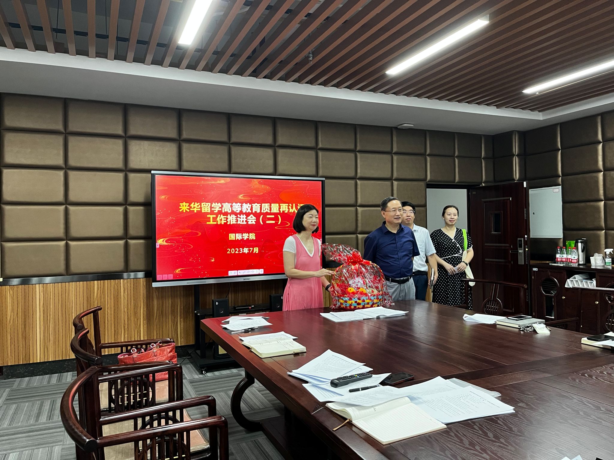 7月14日上午,校党委书记彭育园一行慰问国际学院暑期在岗加班的教职工,指导来华留学质量再认证工作。校办公室主任王春亮、副主任李琳陪同慰问。