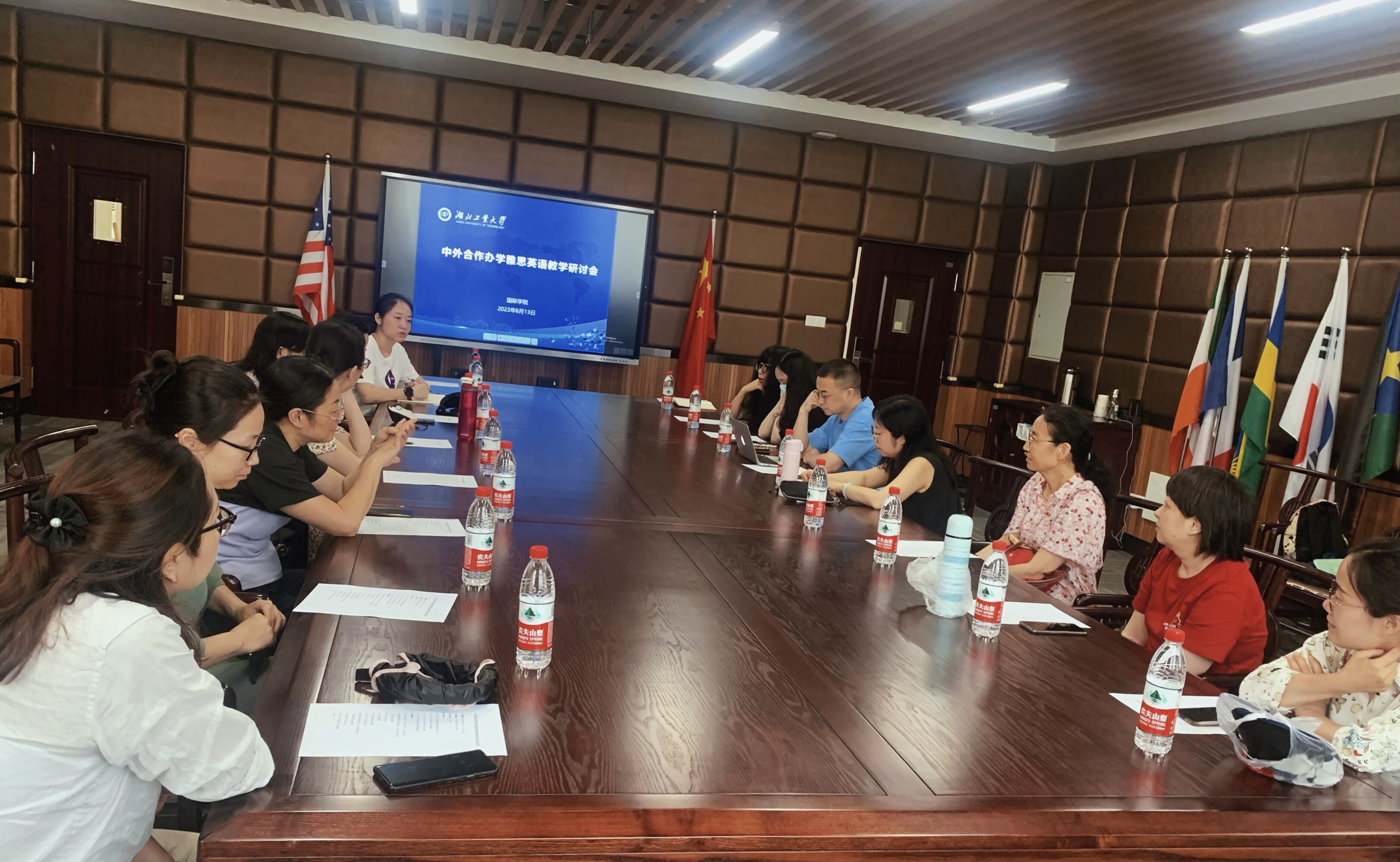 6月13日,国际学院组织召开中外合作办学项目英语教学研讨会,外国语学院参与中外合作办学项目英语教学的13名教师参会并做交流。会议由国际学院副院长龙曼莉主持。