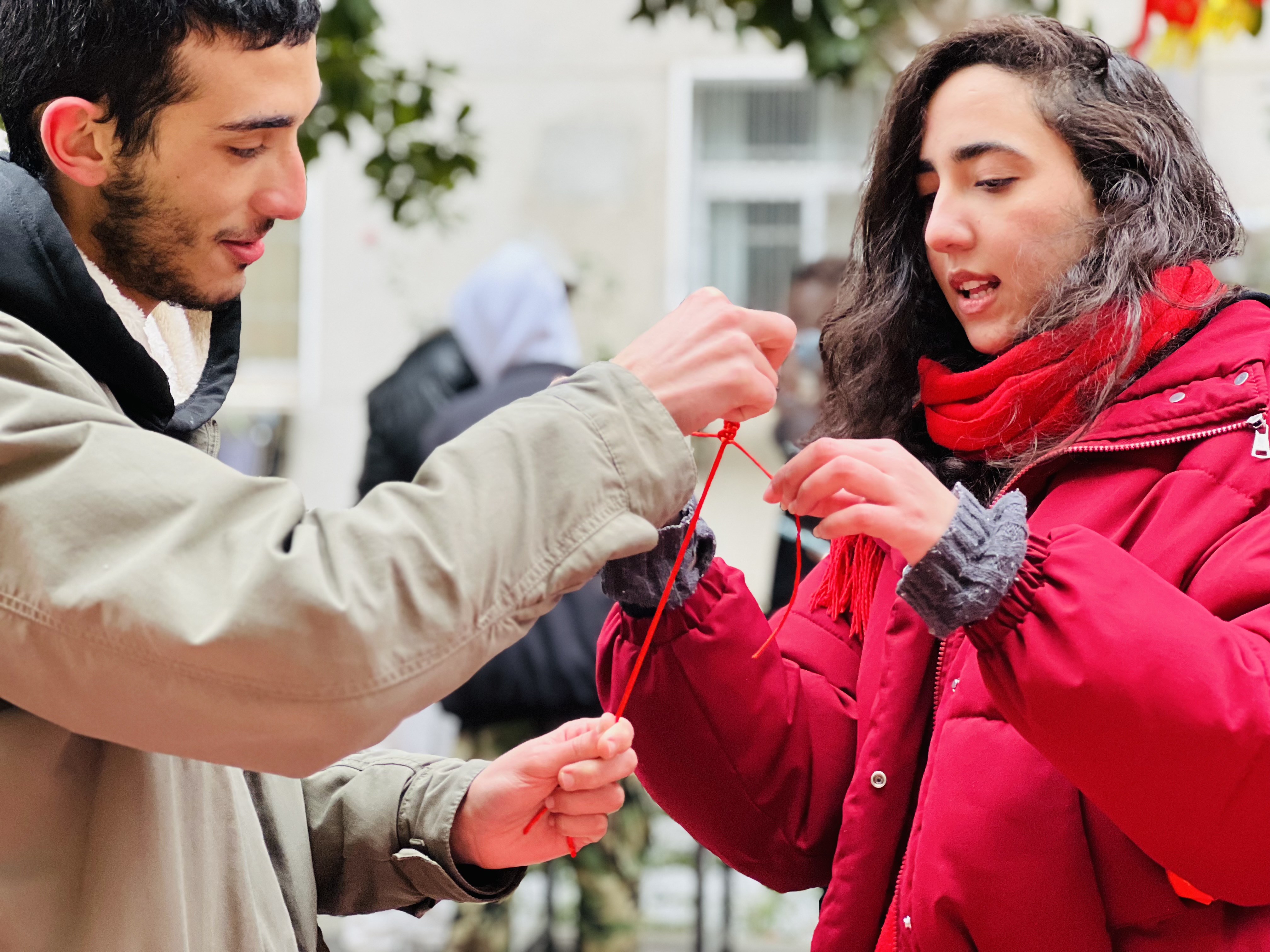 国际学生宿舍园区,张灯结彩、喜气盈庭。以“同书中国字”“同剪纸窗花”“同编中国结”为主题的中国传统文化体验展台,引众多国际学生驻足,他们兴趣浓厚,跃跃欲试。在老师们的指导下,他们挥毫泼墨,一撇一捺传递着新春的美好祝福,一笔一画描绘着求学中国的梦想;他们裁云剪水,一折一叠勾勒出春的多彩,一刀一剪剪出了大千世界;他们丝丝入扣,一经一纬编织出幸福吉祥,一抽一修传承着古典的浪漫。