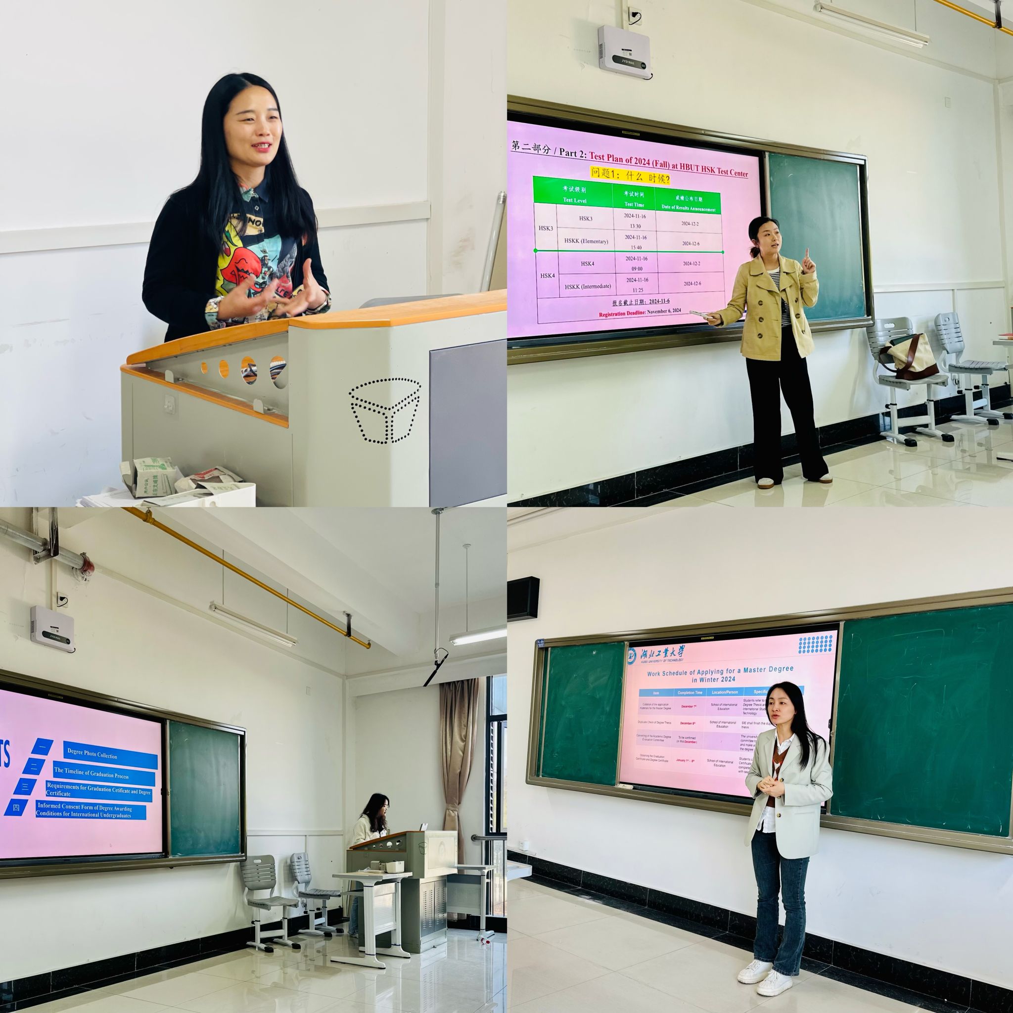 2024年10月23日下午,国际学院召开2024年冬季来华留学毕业生大会。2024年冬季本科和硕士全体毕业生、国际学院副院长龙曼莉、国际中文教育系教师贺宇静、培养办主任王晓莉、本科生教学秘书张妍、研究生教学秘书汤莉参会,会议由王晓莉主持。