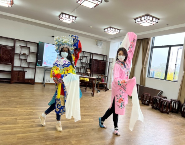 在国际学院传统乐器实验室,中外学生身着京剧行头,拂袖亮相,与校团委大学生艺术教育中心梁琴老师一起走进了国粹京剧的缤纷世界。在梁老师的细心讲解和示范下,同学们了解了京剧角色的行当划分、体验了京剧舞台上的基本动作和亮相动作,还饶有兴趣地进行了角色扮演。中外学生对京剧艺术兴趣浓厚,通过近距离接触和亲身实践,让他们对中华传统文化更加热爱,进一步了解了中国文化;中外学生融合,多元文化交融,也提升了同学们的跨文化能力。
