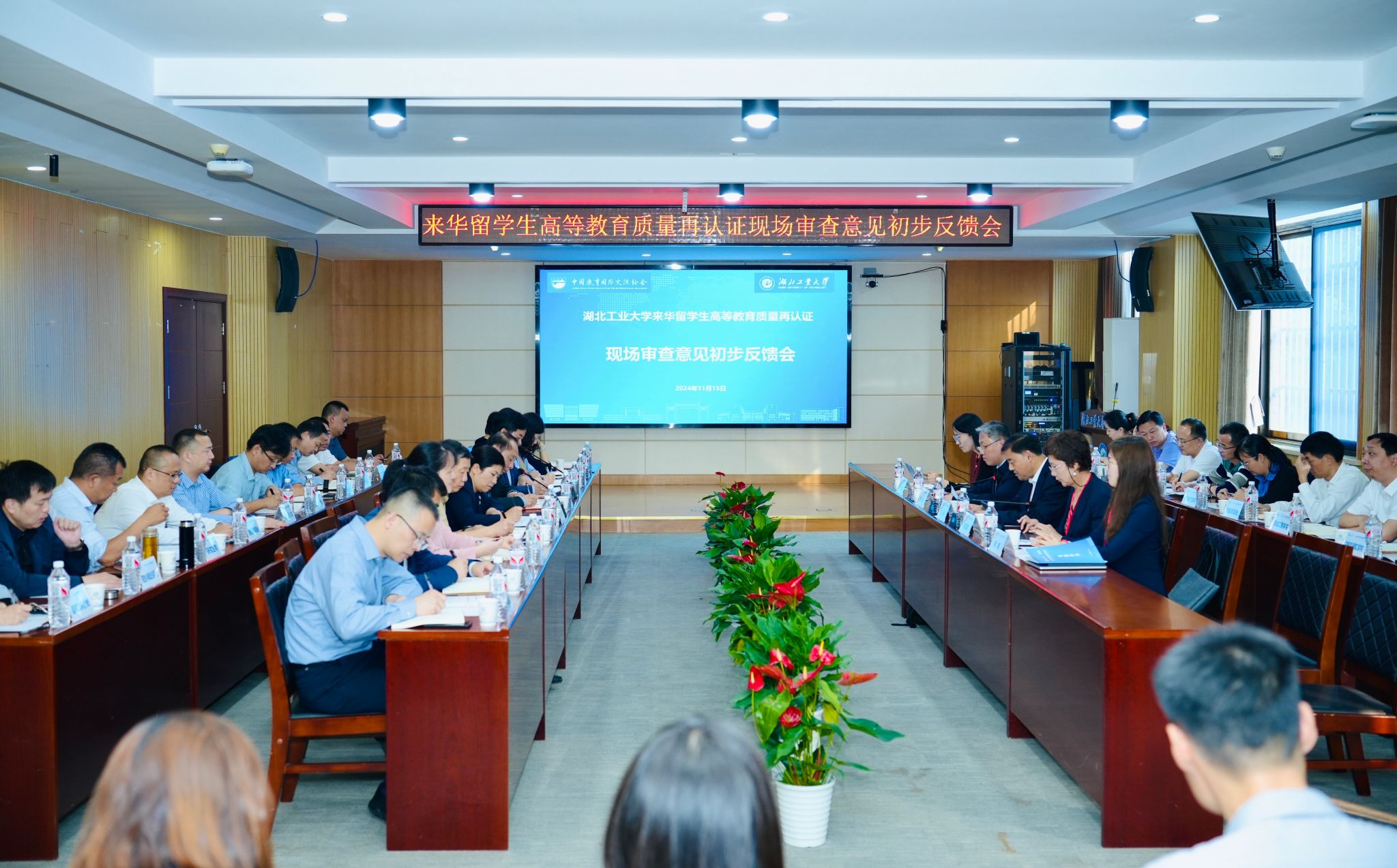 11月14日至15日,来华留学生高等教育质量再认证专家组到我校开展现场审查工作。认证专家组由中国教育国际交流协会跨境教育质量保障部主任何培带队,中南大学外事顾问(副厅级)、国际合作与交流处原处长白毅担任组长,成员有中国高教学会外国留学生教育管理分会副秘书长、西安交通大学国际教育学院原常务副院长宋玉霞,北京理工大学留学生中心副主任谢非,浙江科技大学国际教育学院招生办与拓展办主任陶健,中国教育国际交流协会跨境教育质量保障部项目官员张一凡。湖北省教育厅对外合作与交流处副处长陈曦,校党委书记彭育园,校党委常委、副书记胡晓艳,党委常委、副校长王侃,党委常委、纪委书记秦防修,党委常委、副校长宋小春,党委常委、组织部部长桂丽,湖北工业大学来华留学生高等教育质量再认证工作领导小组全体成员,学校相关职能部门负责人和培养学院负责人,国际学院全体教职工,学校教师代表和国际学生代表参加了相关活动。校党委副书记胡晓艳主持再认证现场审查说明会和反馈会。