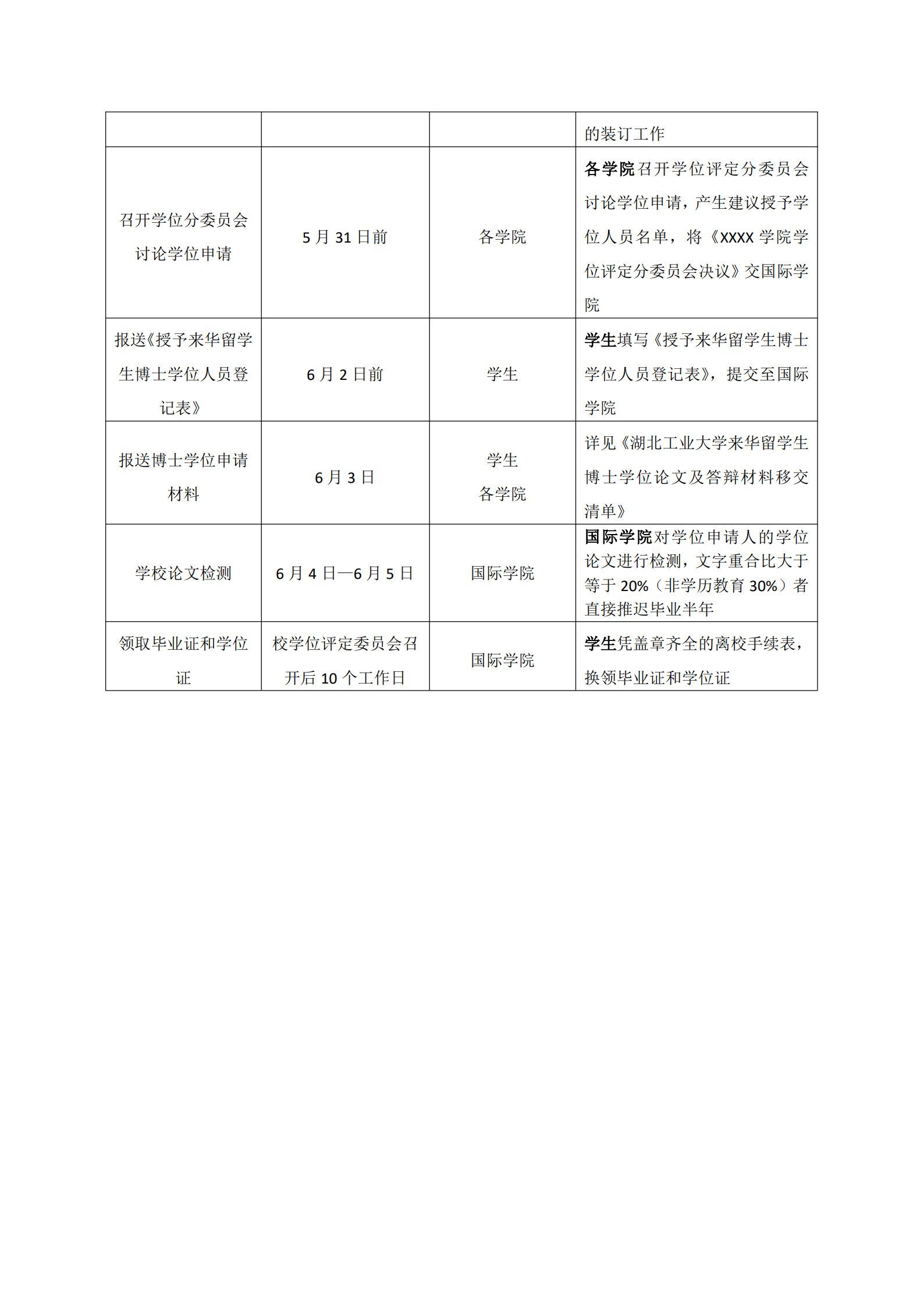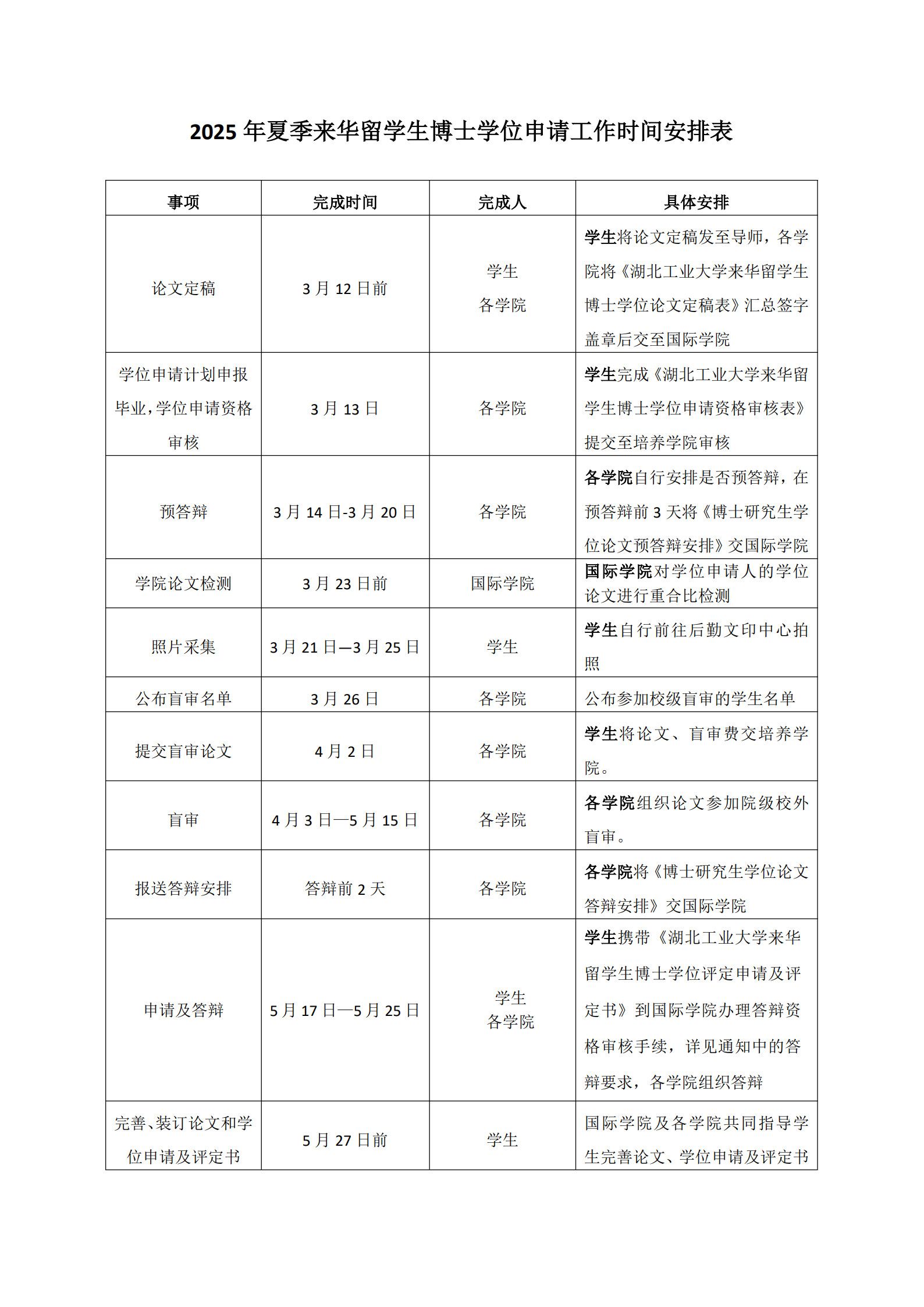 根据《湖北工业大学来华留学生学位授予工作实施细则(修订)》(湖工大国际[2022]21号)等文件精神,现就做好我校2025年夏季博士研究生学位论文答辩及学位授予工作提出如下要求,请按照通知要求和工作流程做好相关工作。