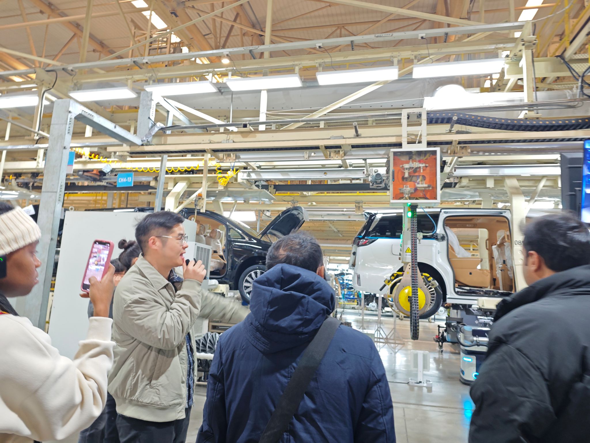 Next, the students entered the final assembly workshop at Lantu Automotive. On the production line, they had the opportunity to closely observe Lantu’s advanced manufacturing processes, gaining a firsthand understanding of the application of Chinese intelligent manufacturing in the new energy vehicle sector. On the highly automated assembly line, robotic arms precisely inspected components such as tires and car doors, while an advanced AI monitoring system conducted real-time, accurate checks on every stage of the production process.