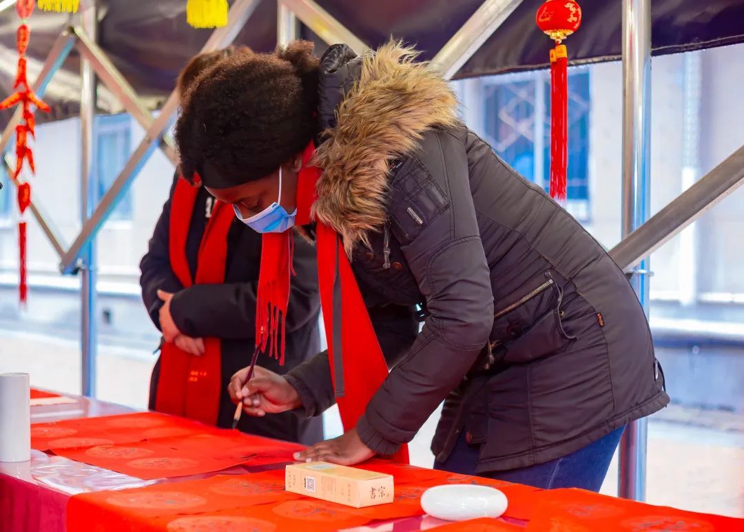 国际学生在老师的指导下,一撇一捺,画就充满年味的福字,一笔一划,写就充满祝福的春联。