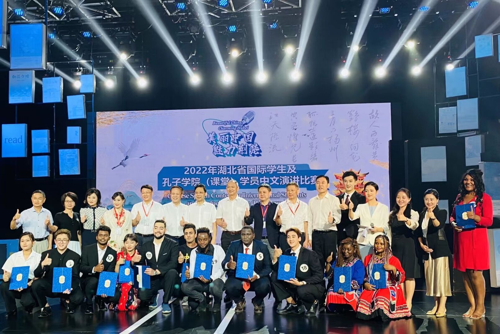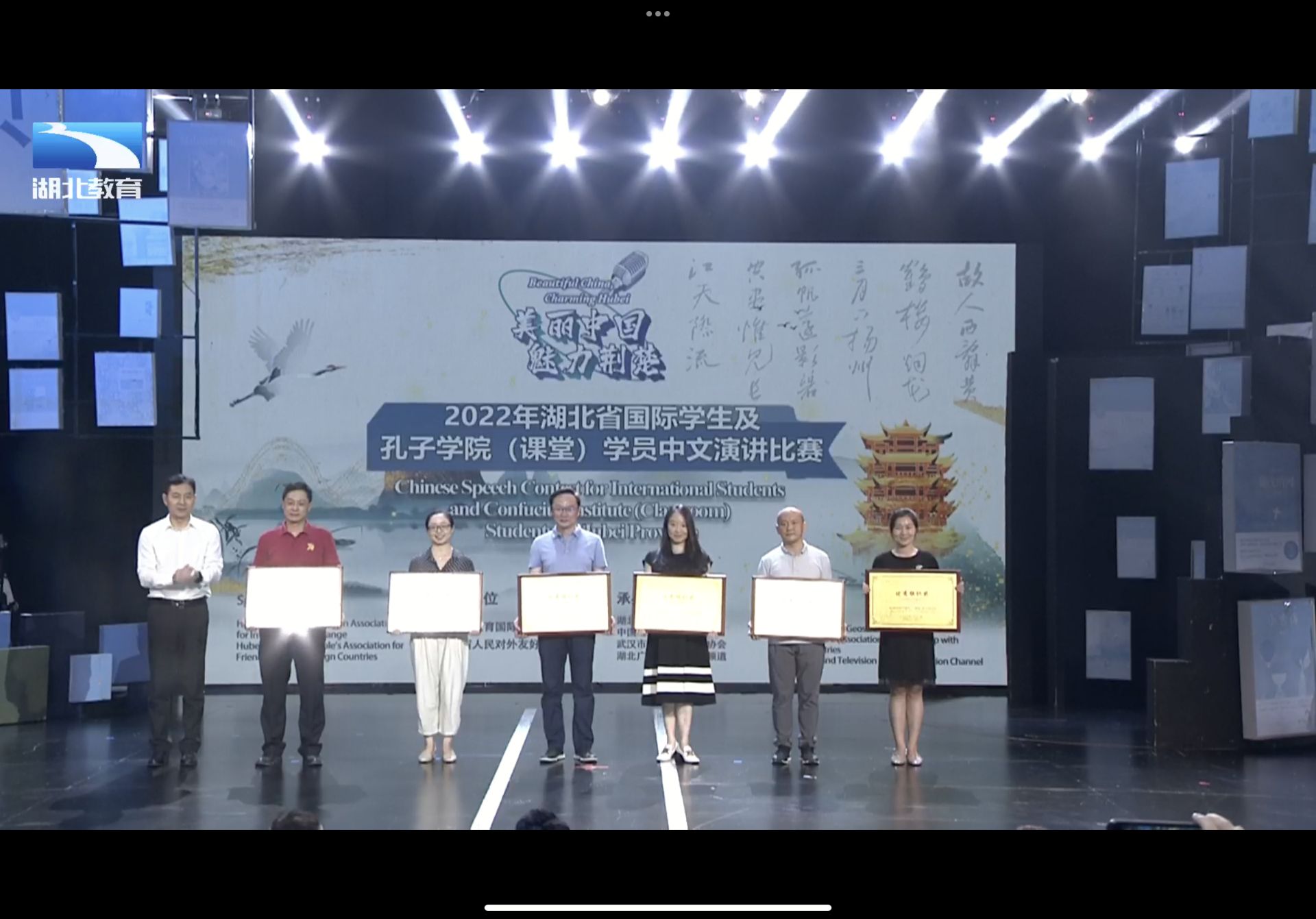 8月12日, 2022 年湖北省国际学生及孔子学院(课堂)学员中文演讲比赛决赛在湖北广播电视台举行,我校国际学生表现优异,获奖成绩名列湖北省高校前列。省教育厅副厅长、党组成员、省委教育工委委员余学敏,湖北省教育国际交流协会会长、湖北大学副校长蒋涛,湖北省人民对外友好协会秘书长徐浪舟等出席比赛并为获奖选手和单位颁奖。